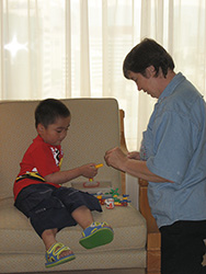 When we got back from Walmart, we showed Tyler his new toys. I built him some vehicles out of his legos. He watched me making them and then took them from me when I offered them to him. A couple of them had windmill type pieces on them that he liked to spin. We decided to try giving Tyler a bath again, and he accepted it much better this time, he didn't cry at all.... don't know that he liked it, but he didn't fuss about it. After his bath, Amy came in to get our laundry to send out. While mom was talking with Amy, I tried to play catch with him with his ball. He held it at first, but then tossed it to me. We played catch together for several minutes. Another breakthrough as far I was concerned... he actually was playing 'with' us.