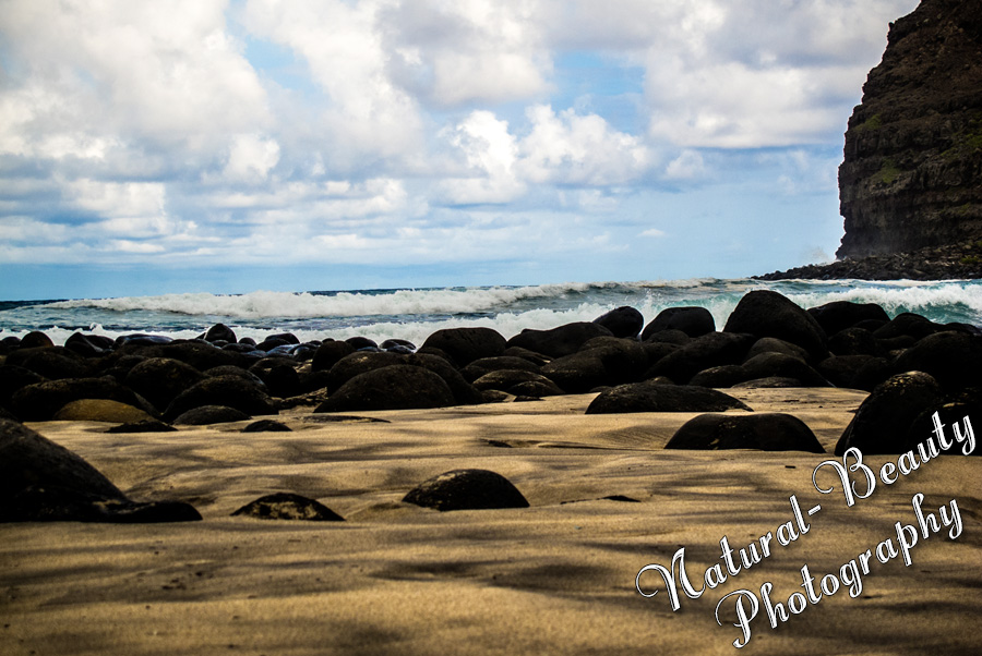 We took a break and had a lunch that the Hui cooks had packed for us. It was fantastic as all of their cooking was throughout the week. Once we were done with lunch, we took a short drive to the Halawa Beach. Rikki said that the recent weather had changed the looks of the beach. I loved the colors in the sand. It had a black and sandy marbled look. The lava rocks all over were interesting as well. I wandered off to the side where all you could see were lava rocks at the base of a tall cliff and got some great pictures there. As I was coming back to the beach area, I was being beckoned so we could get moving on to our next location - hopefully they hadn't been waiting for me too long. :)
