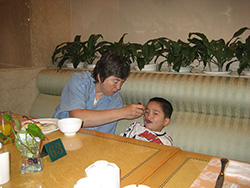 The hotel doesn't start serving breakfast until 7:00, so we had a couple hours to kill in the hotel room. We really hoped that he wouldn't wake up quite so early because it is a lot harder on him sitting in the hotel room with nothing to do. We made it through the time and went down for breakfast right at 7:00. Tyler didn't want to feed himself at our first meal together, but was willing to eat if mom fed him, so she did. At the orphanage, they have congee most of the time, so we got that for him and a banana since we know he likes those. We found out he doesn't care for the potatoes they had - he ate it, but you could tell he didn't really want to. Amy met us about half way through breakfast and got him a boiled egg, which he ate on his own after she peeled it for him, and then he also ate more congee on his own. He ate really good, maybe too good. Just as we were getting done with breakfast, we had a breakthrough... Tyler said something to mom, of course we couldn't understand, but by his body language we could tell he needed to go to the bathroom. He spoke to us, which was wonderful.![]()